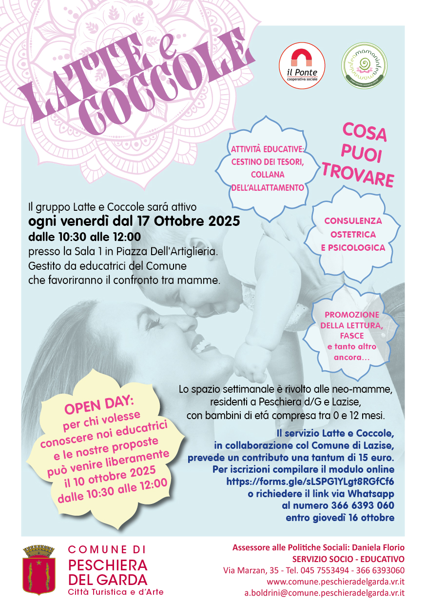 "Latte e Coccole" è dedicato alle neomamme e ai bambini da 0 a 12 mesi, si svolge il venerdì mattina dalle 10:30 alle 12:00. Il link per l'iscrizione è: Modulo di Iscrizione Latte e Coccole