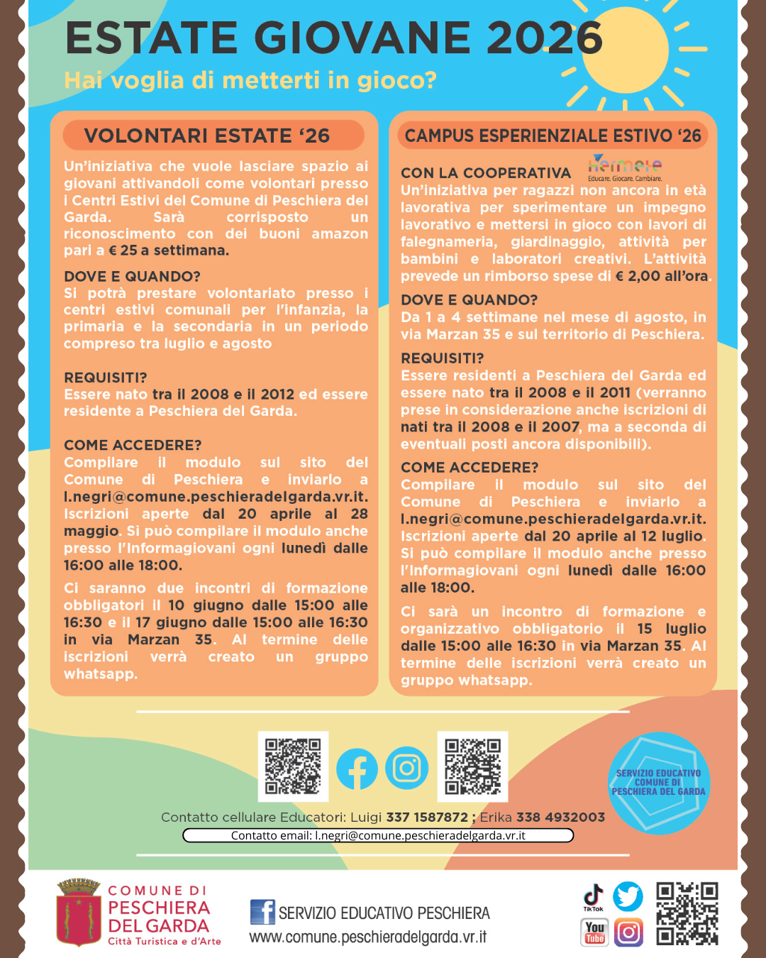 🙋 Volontari Estate '26 – Sei nato tra il 2008 e il 2012 e sei residente a Peschiera? Puoi fare volontariato nei centri estivi comunali tra luglio e agosto, ricevendo buoni Amazon da €25 a settimana. Iscrizioni aperte fino al 28 maggio.