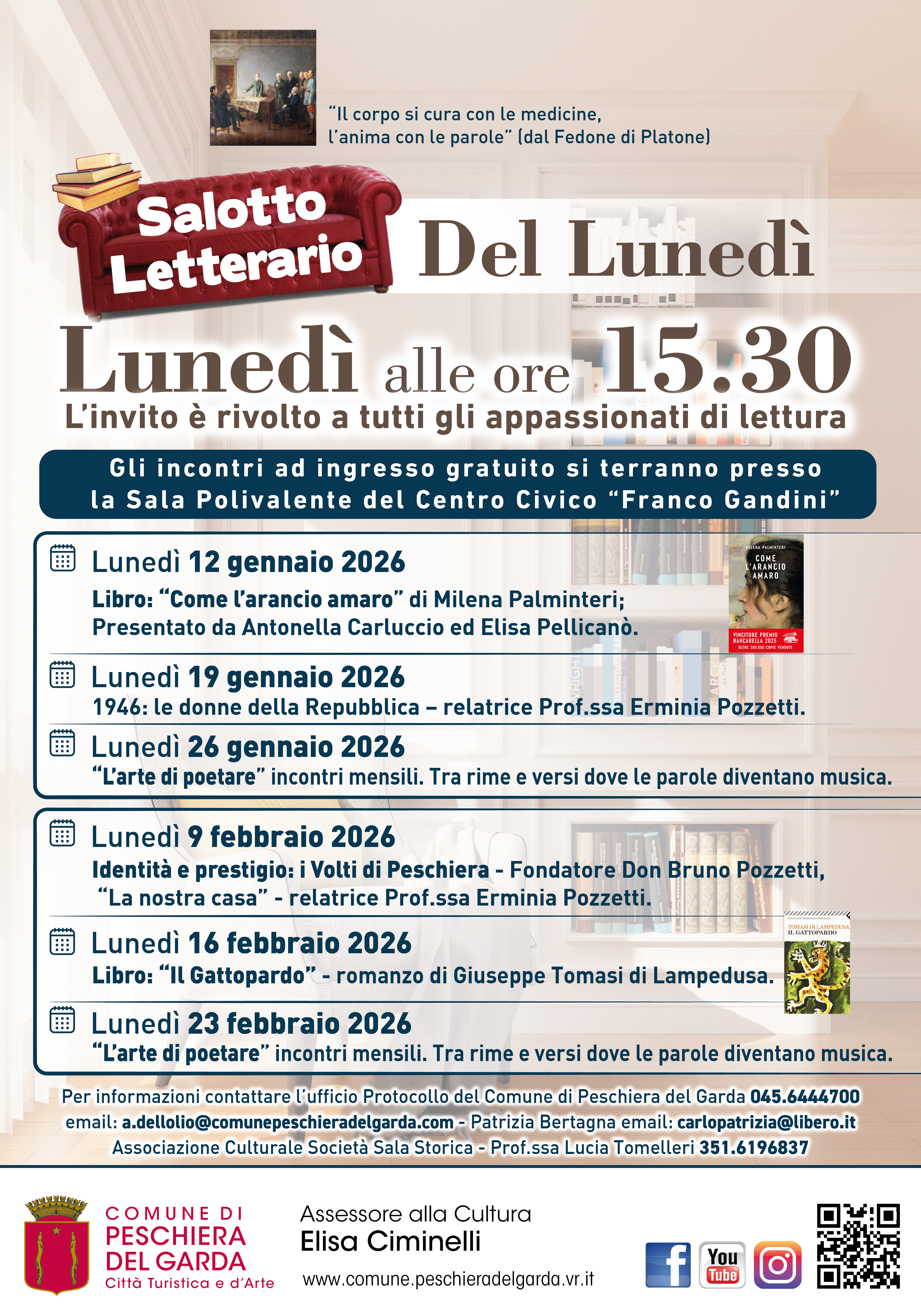 - Lunedì 9 Febbraio, ore 15.30: Salotto Letterario - Identità e prestigio, i volti di Peschiera con la Proff.ssa Erminia Paola Pozzetti