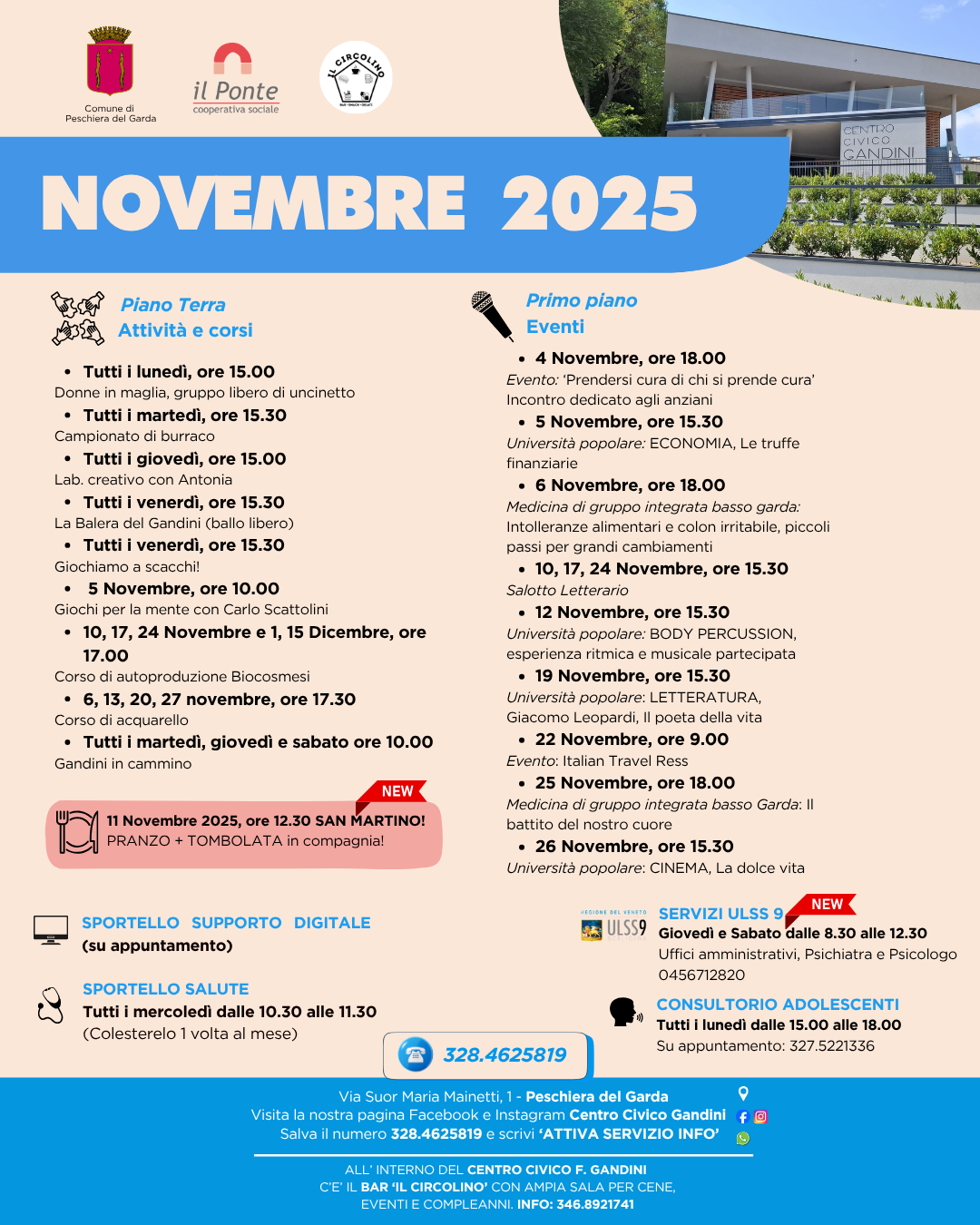 Novità: Servizi ULSS 9 - Giovedì e Sabato dalle 8.30 alle 12,30- Amministrazione, Psichiatra e Psicologo - 0456712820 (Primo piano, si accede dal piano terra)